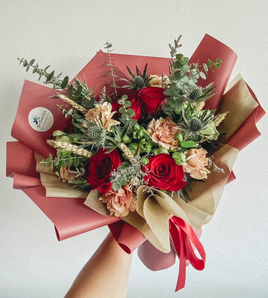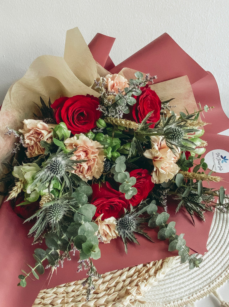 Comes with a rustic mix of 6 stalks of roses and 6 stalks of carnations.