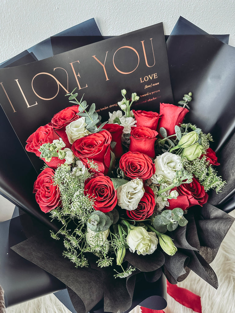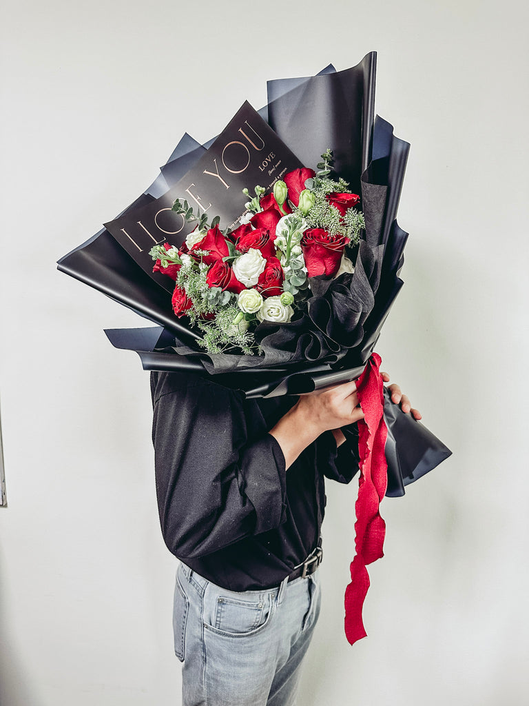 Comes with 12 stalks of red roses, eustomas with eucalyptus.