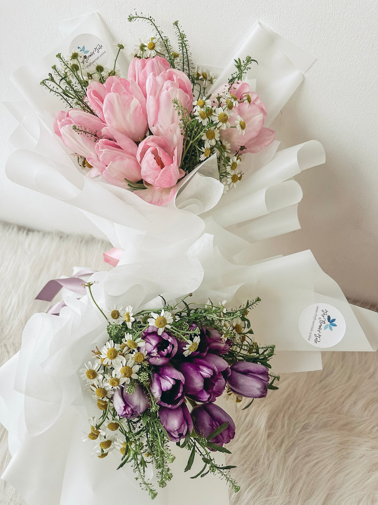 Comes with 8 to 10 stalks of tulips, chamomile flowers and leaves.